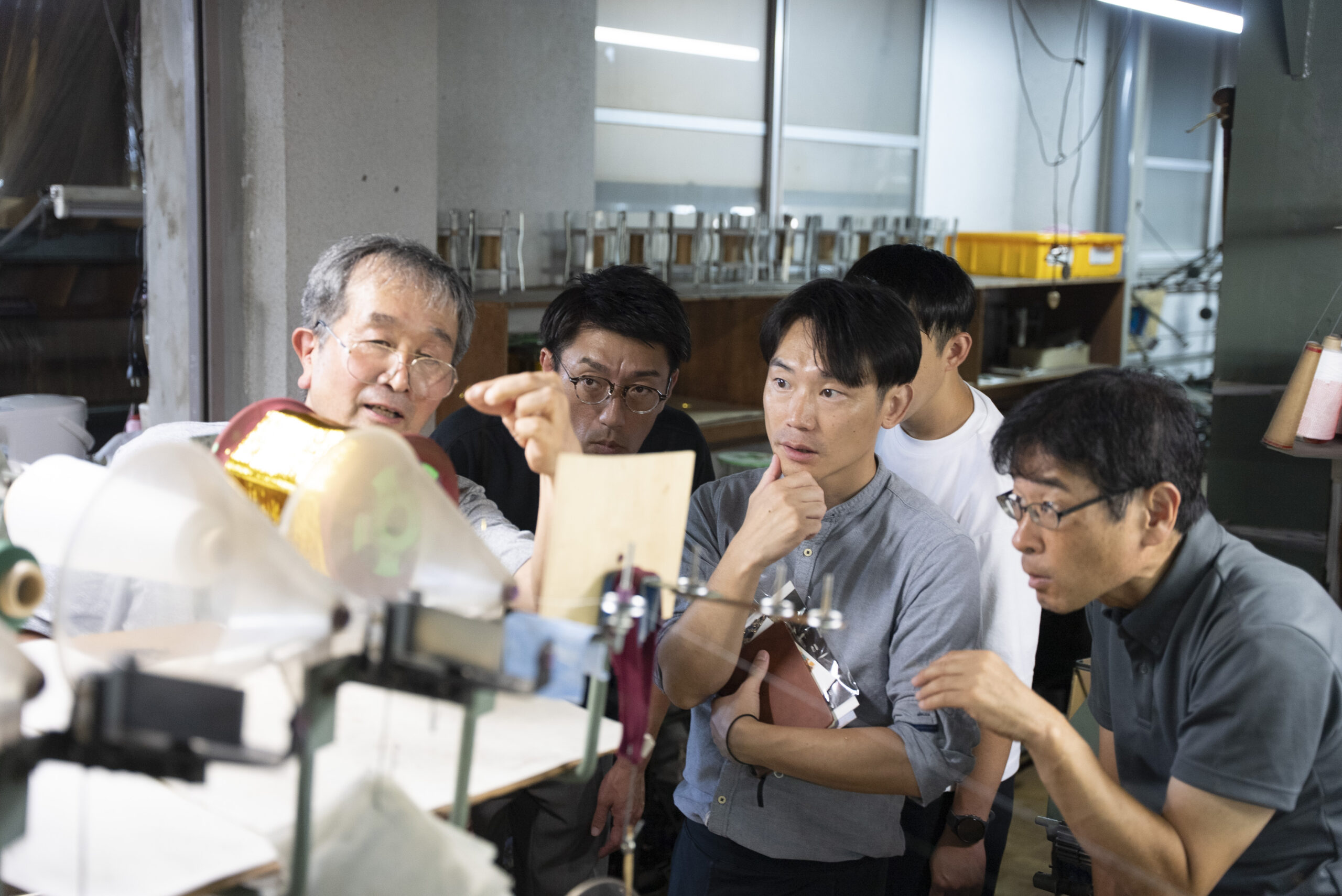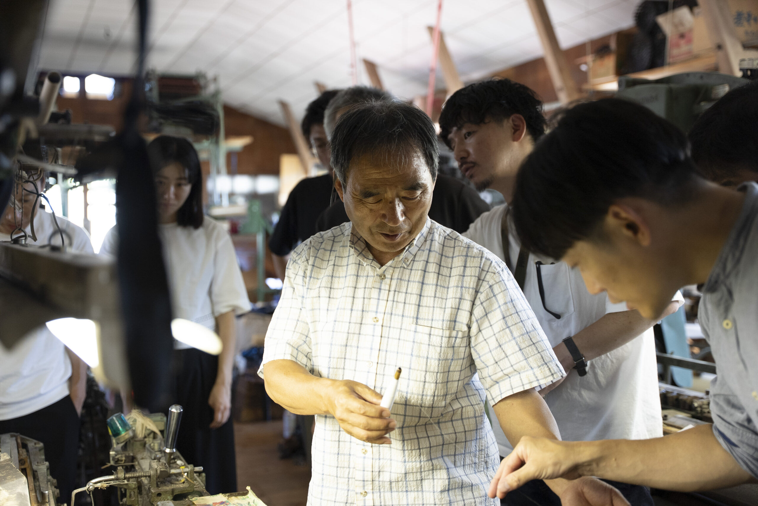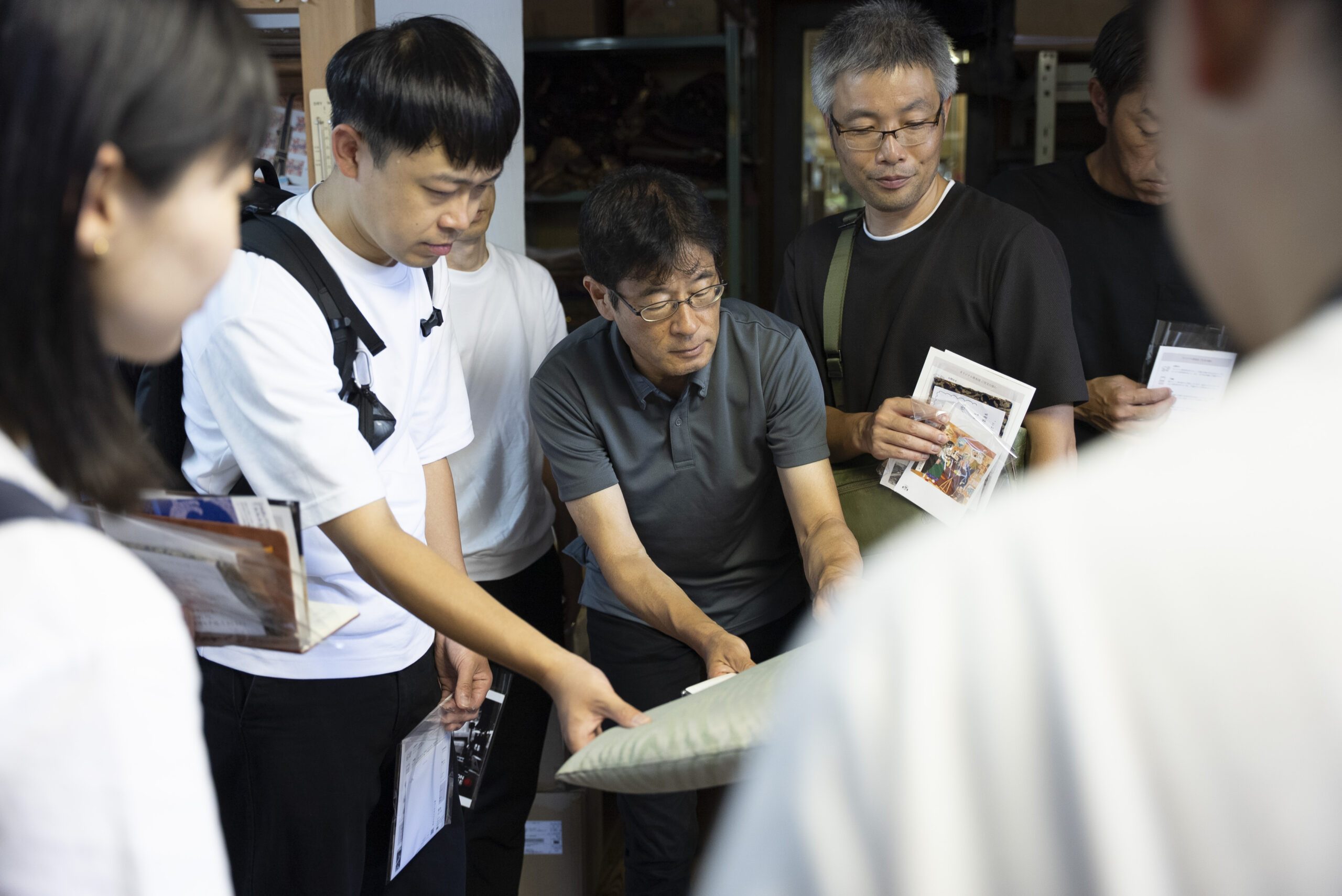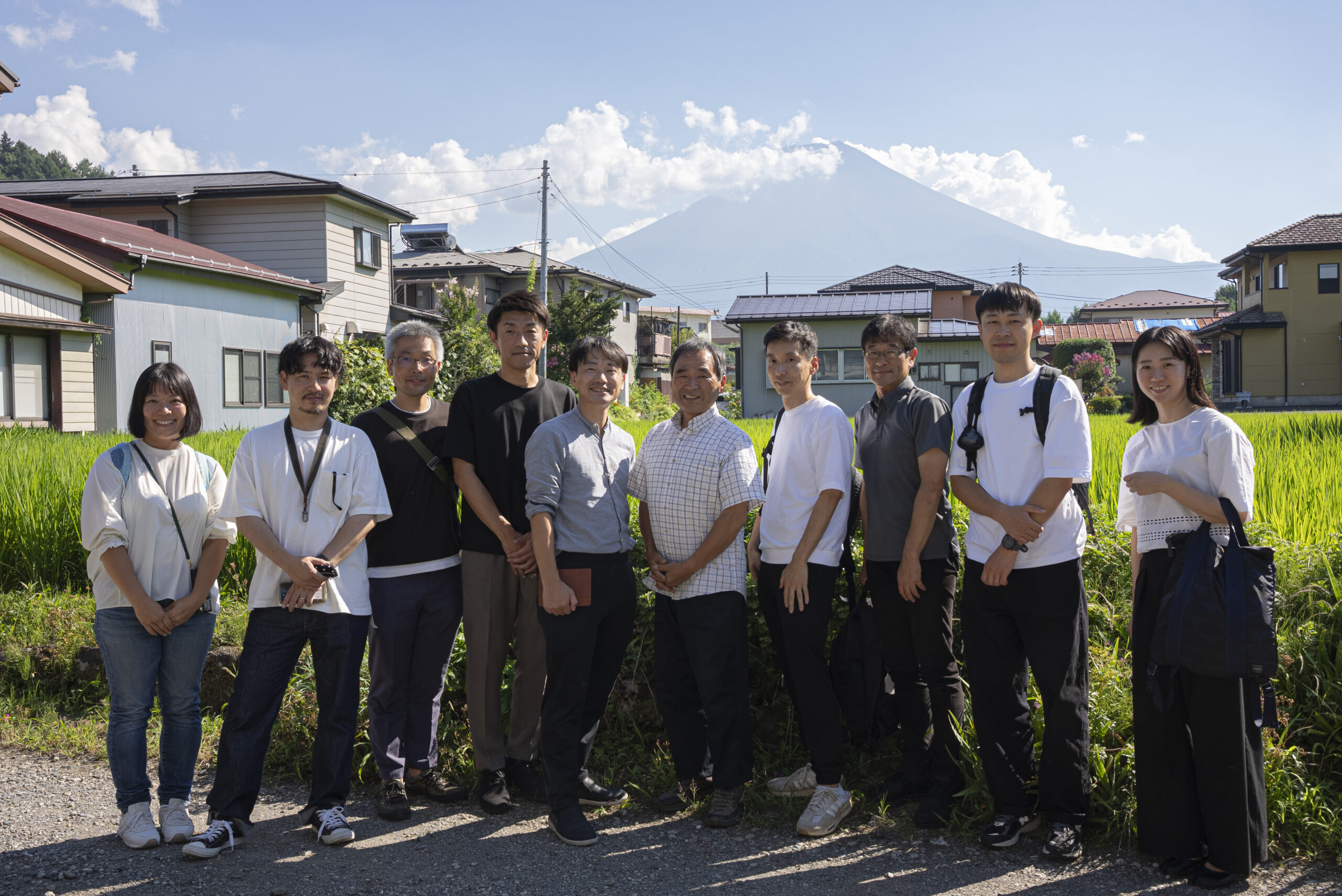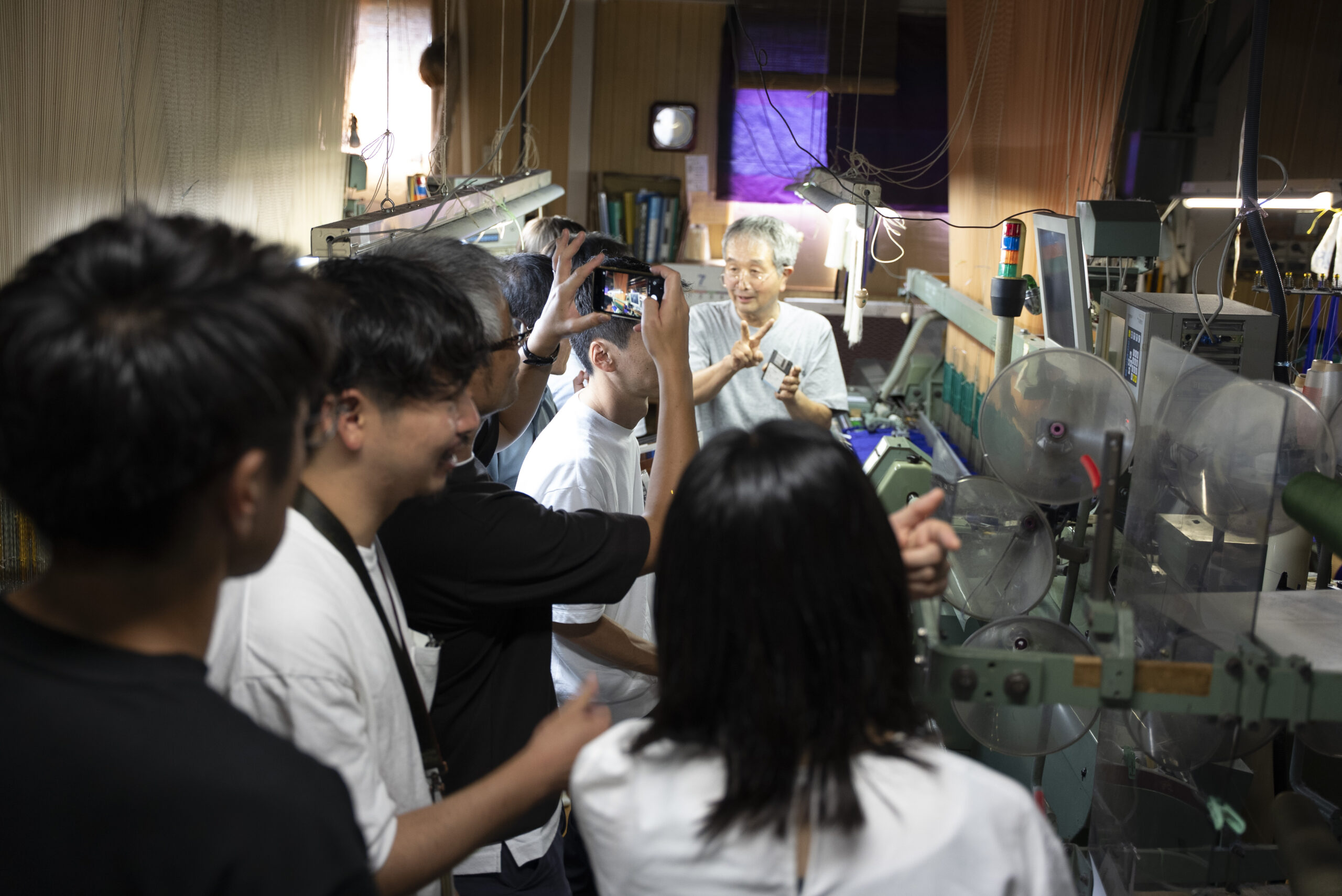 写真には残っていませんが、富士吉田に来ていただいたらぜひ寄っていただきたい北口本宮冨士浅間神社や、富士山駅にある、産地の商品を買うことが出来るミルショップに立ち寄り、実際に一日見てきた織物が商品になる様子もリサーチしていただきました。他の地域に比べると涼しいと言われる富士吉田も、この日は容赦ない日差しに包まれていました。それでも、工場のあちこちでは、その暑さを上回るほど熱のこもった対話が交わされ、ものづくりへの思いが響き合う、実り多い一日となりました。