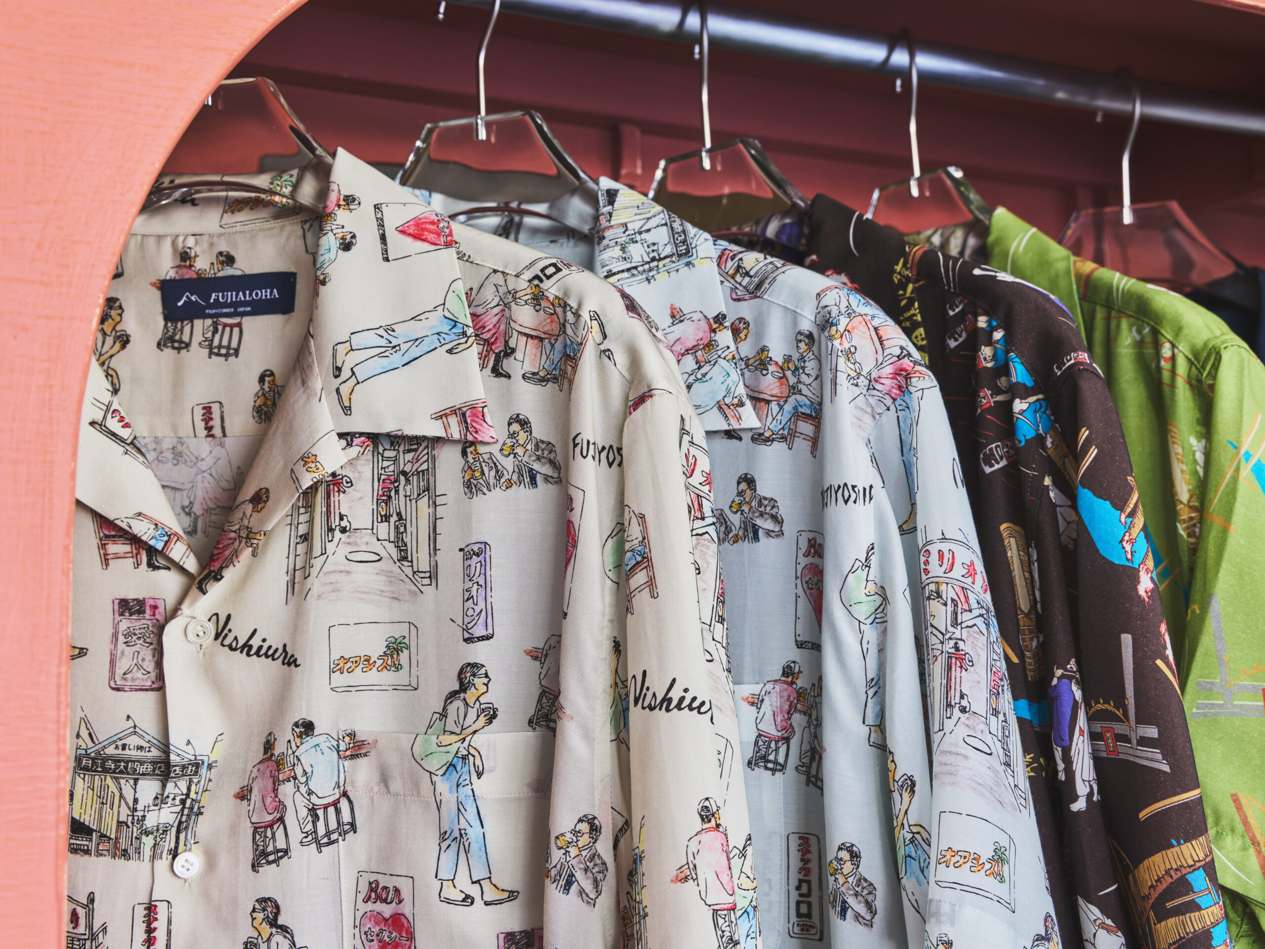 富士吉田産のキュプラ生地100%を使用し、この街のスピリットを表現した上質なアロハシャツを展開しています。近年外国人観光客でにぎわいう本町通り商店街に、ショップもオープンしました。運営は裏地主力の服飾副資材卸である株式会社エルトップ。キュプラ「ベンベルグ」を使った富士吉田産の高級裏地が同社の看板商品で、アロハの生地にもこのベンベルグ織物を使っています。ベンベルグはシルクに近い質感に仕上がるのが特徴です。