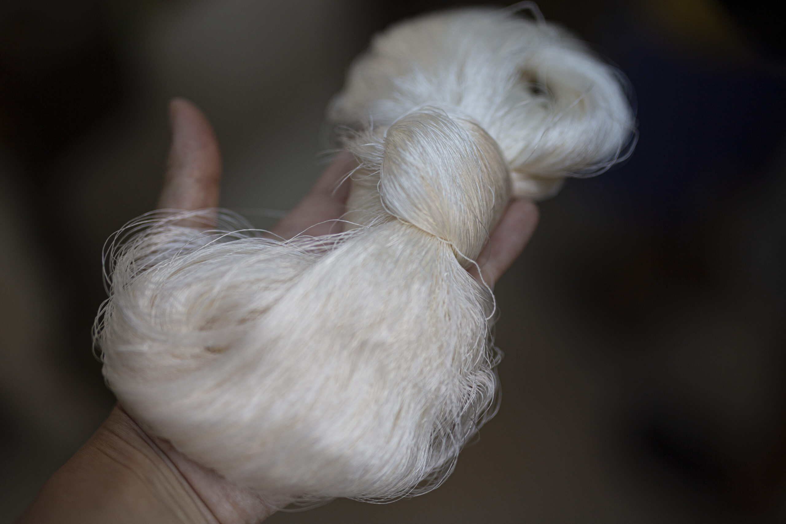 これは糸繰りした糸を泥染めしたあと、括り糸を少しだけ外して見せていただいたもの。5本、10本ずつ束ねて染めるというものの、この細かさ、おわかりいただけますでしょうか…
