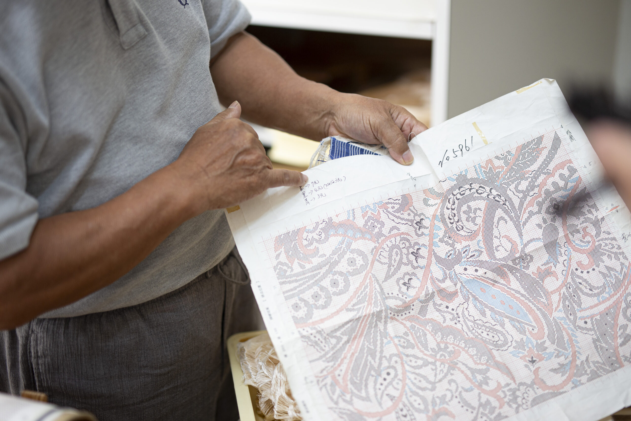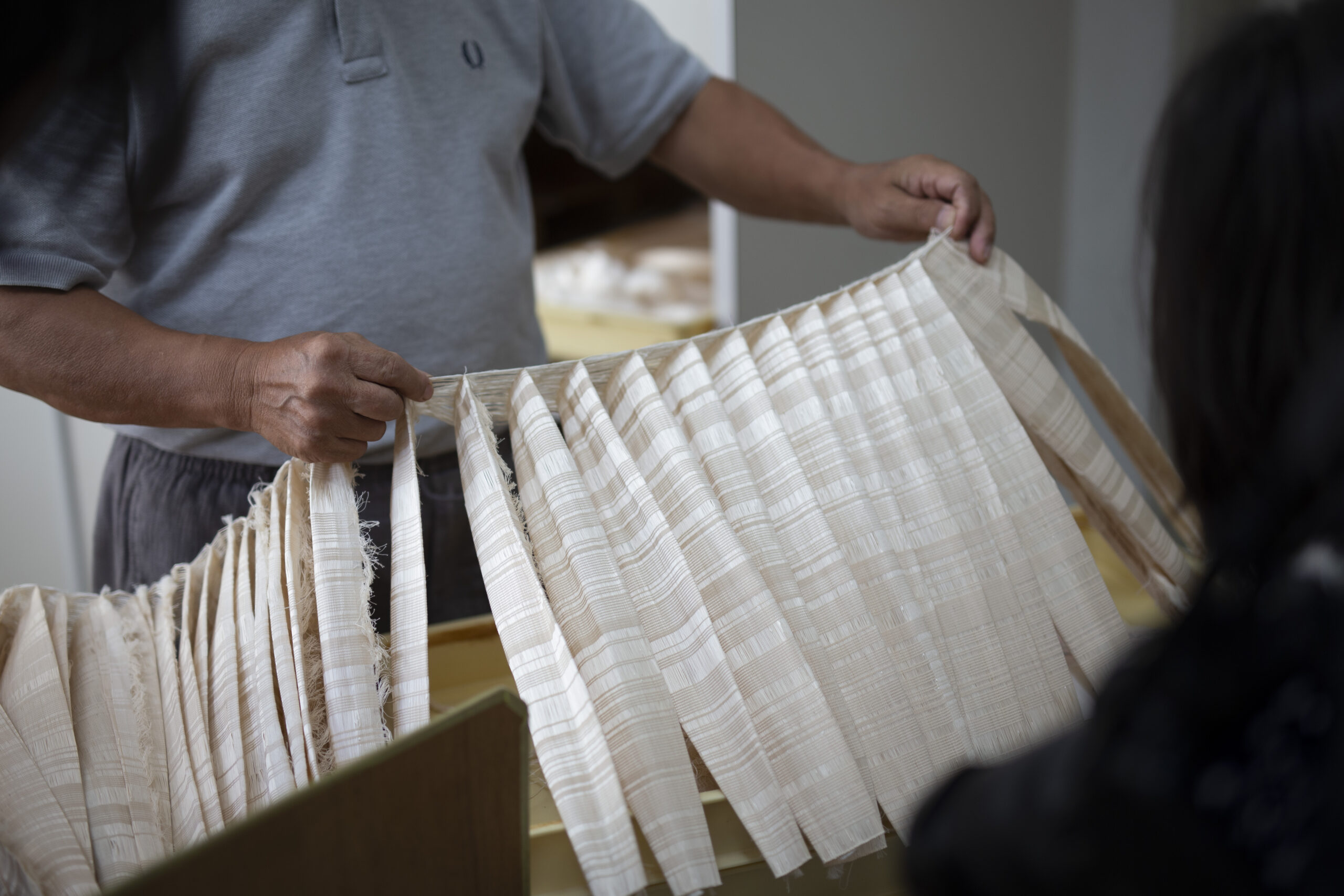 まず最初に向かったのは「本場奄美大島紬協同組合」です。大島紬はたくさんの人の手と長い時間をかけて生み出されます。その工程は、大きく分けると30以上の工程があり、半年から一年という長い時間をかけて、一反の織物が完成します。デザインの原画を描く、絣締めをする、テーチ木で染めるなど、それぞれの工程には、その分野に精通した専門の職人がいて、担当する工程を仕上げ、次の工程、次の工程へと渡していきます。織り上がった大島紬の「製品検査」を担うのが、この大島紬協同組合です。