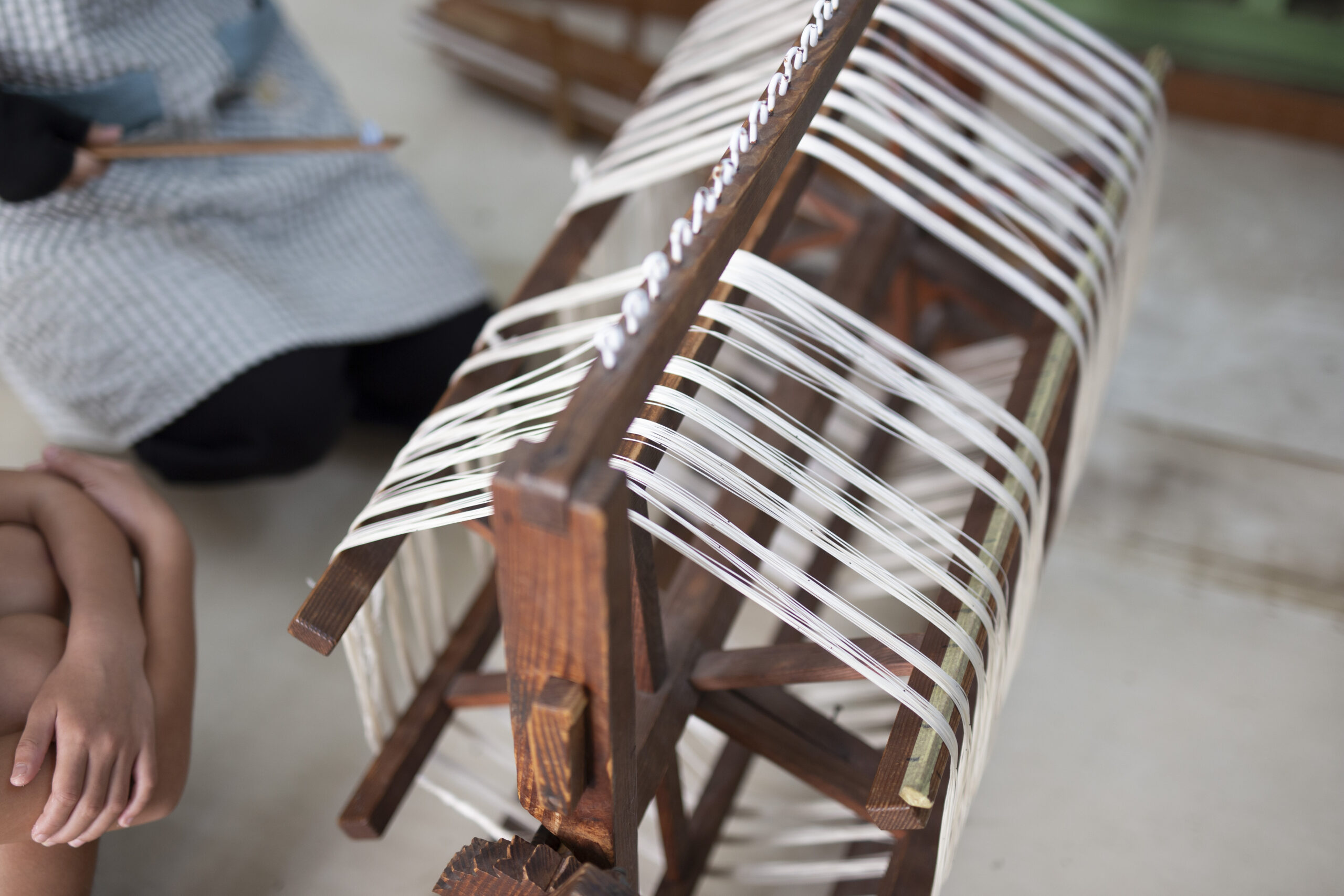染めた経糸を織機に設置している様子。ここに染めたヨコ糸を織り込んでいくと模様になります。まだこの段階ではどんな柄になるか素人では想像がつきません。