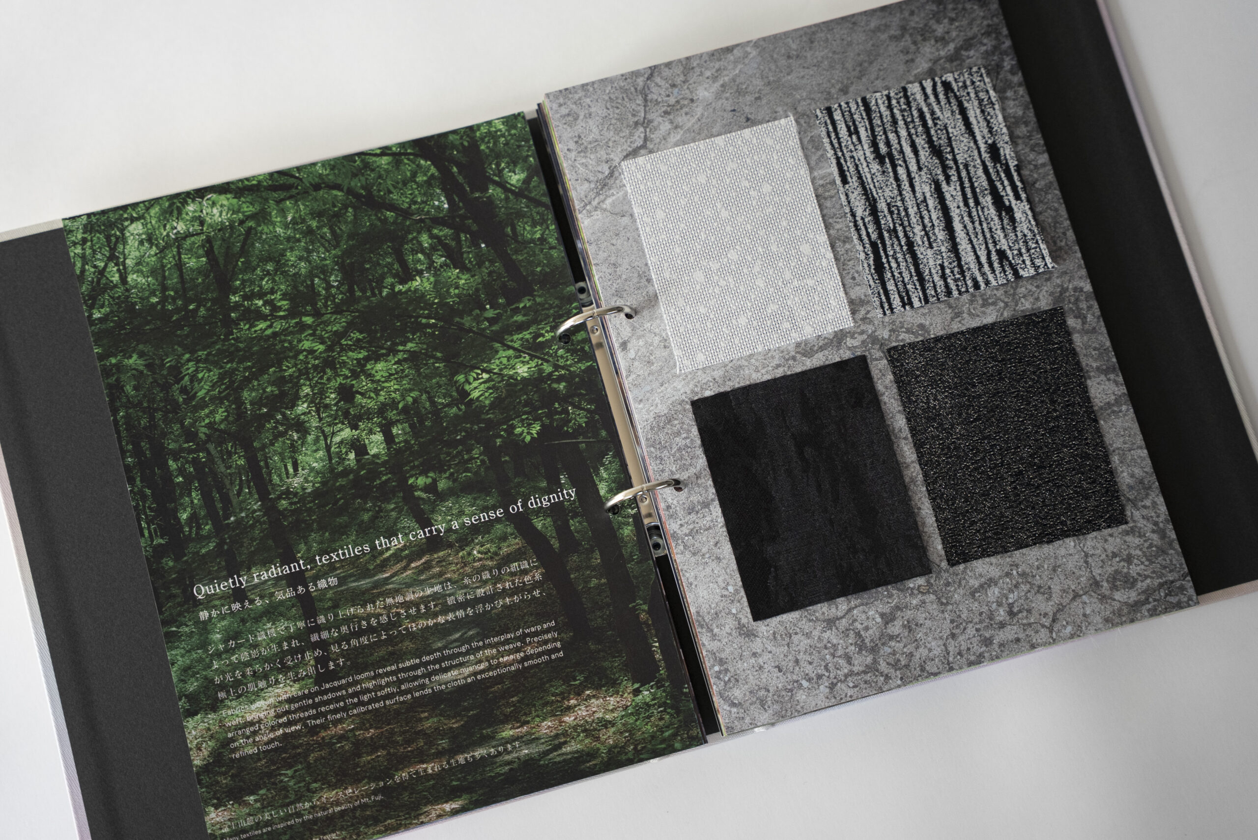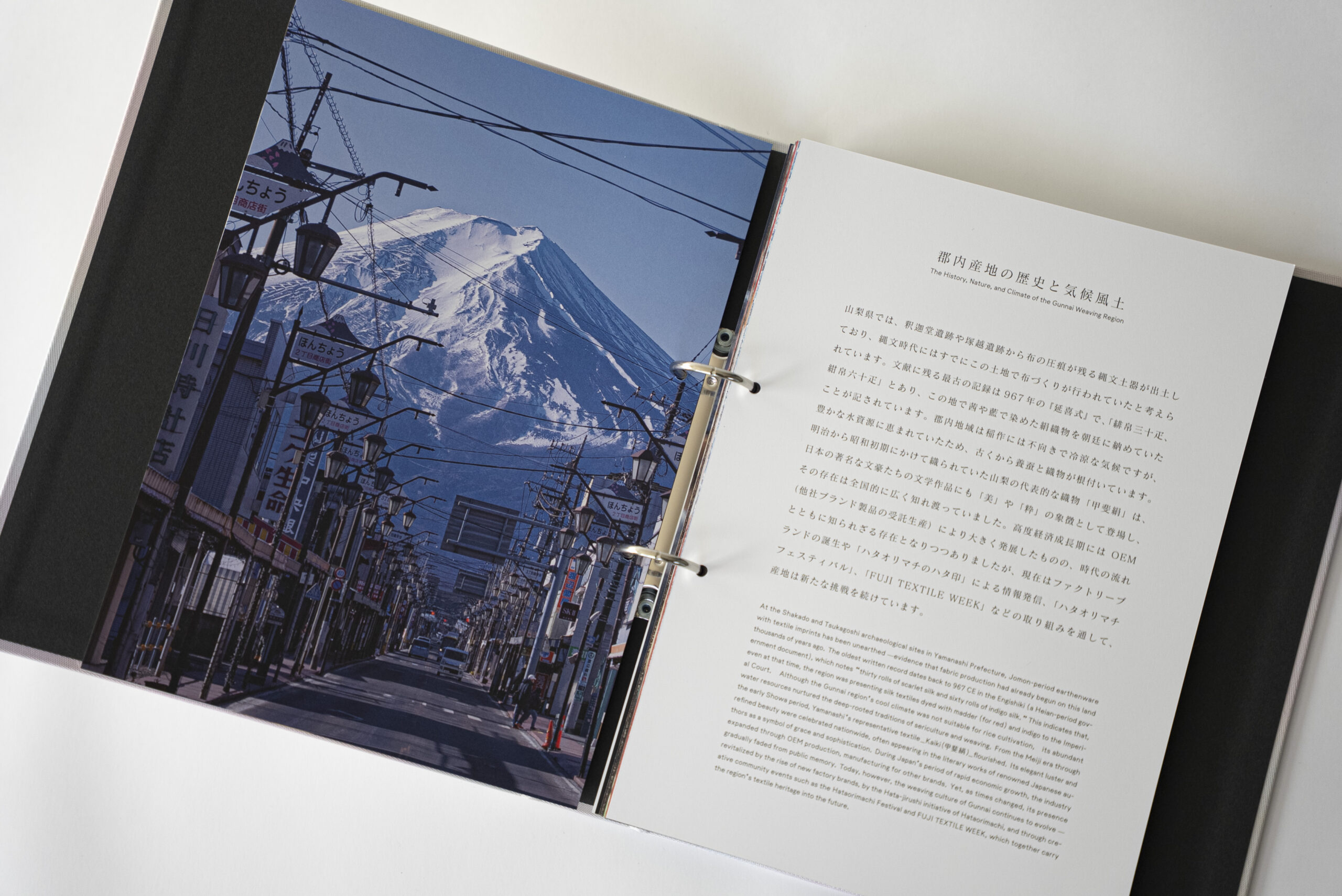 本冊子タイトルの「LOOMSCAPE」は、織機を意味する「LOOM」と、風景を意味する「SCAPE」を紡ぎ合わせた言葉です。産地の歴史や技術に加え、富士山麓の自然環境、織物が生まれる土地の風景、人々の営みまでをビジュアルとともに収録し、機屋さんの仕事そのものを“風景”として伝えたいという想いが込められています。